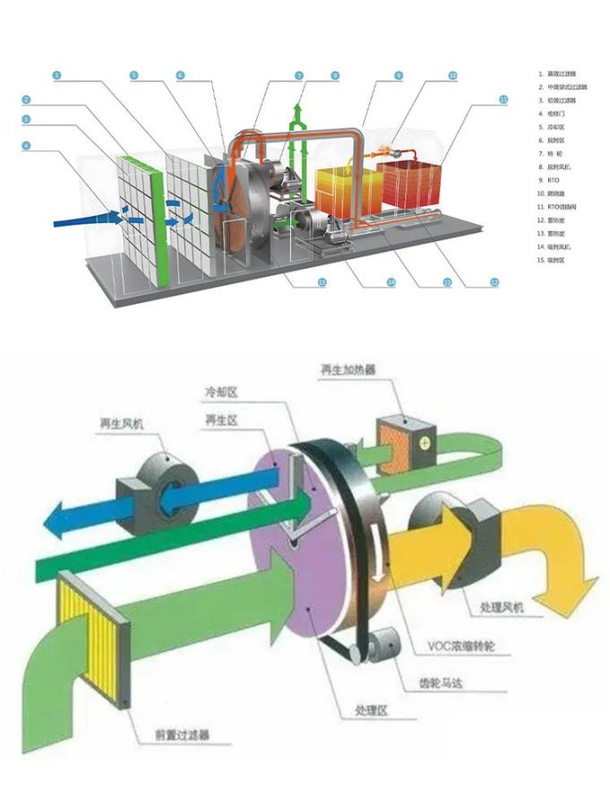 脱附区:转轮由吸附区转入脱附区,吸附在沸石中的VOCs 分子在脱附180~220°C的热空气向脱附并浓缩,浓缩倍数为5~25倍,浓缩后的高浓度VOCs废气经后续CO或RTO处理达标后排放。