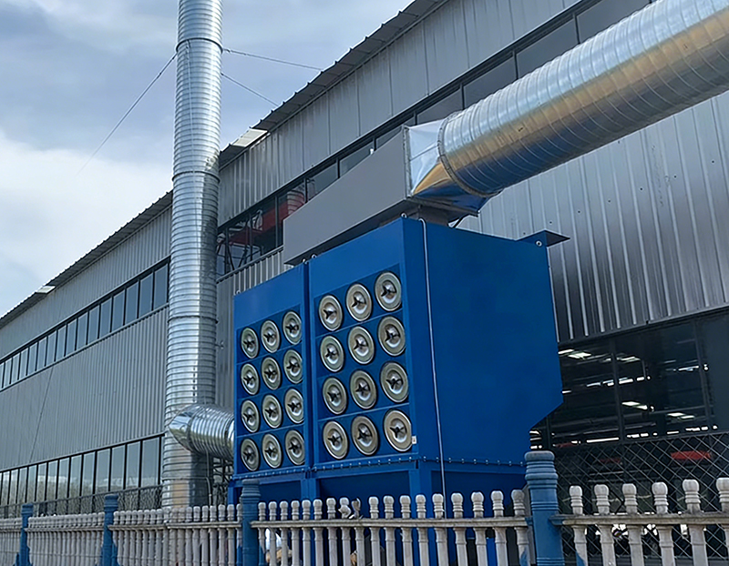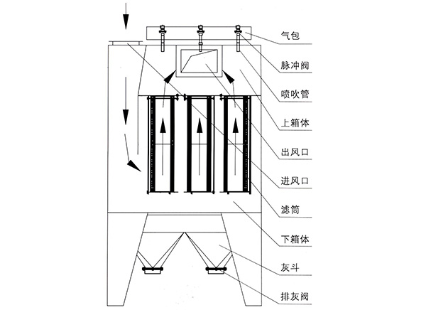滤筒除尘器通过滤筒过滤和脉冲喷吹清灰实现高效除尘,核心部件包括滤筒、脉冲阀和灰斗。滤筒采用聚酯纤维材料制成,含尘气体经滤筒过滤后,尘粒被阻留在表面,洁净气体排出。当滤筒表面粉尘积累到一定程度时,脉冲喷吹系统启动,压缩空气冲击滤筒表面,将粉尘吹落至灰斗。
